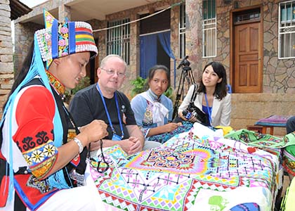“阿着底是个好地方,撒尼人勇敢又坚强;……火把节是撒尼人的节,火把节到人人忙;山茶花是撒尼人的花,火红的山茶世无双。谁是抬跤场上得胜的人,绣朵茶花披在他身上。”歌声从一棵很大的榕树后面透过来,围着树杆绕了大半圈,才见阿诗玛一边唱着一边在一幅长绸上面绣花。相信谁都不会忘记电影《阿诗玛》中的这个经典镜头,心灵手巧的阿诗玛正飞针走线,为摔跤场上的英雄绣着红茶花。这应该就是石林彝族撒尼人刺绣在电影中的最初记录。