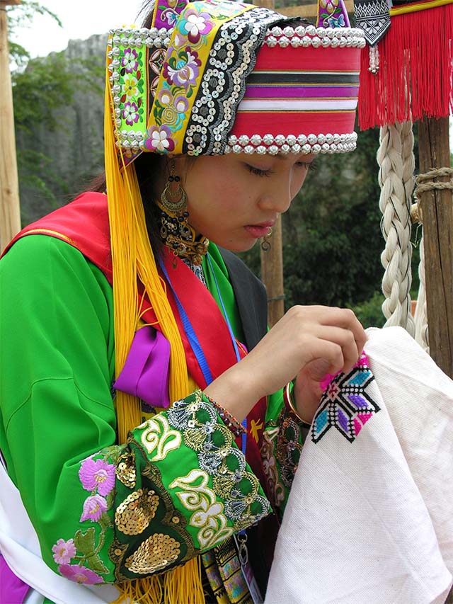 农事之余,妇女们绩麻、纺线、织布,更飞针走线,挑花绣朵,从少年时代就练就娴熟的刺绣技艺。刺绣时,不描样,不划线,胸有成竹,凭着聪慧的头脑和灵巧的手指,绣出多姿多彩的图画。刺绣图案并非凭空想出,而是源于生活。石林独具特色的山川地貌、风物特产,生活中常见的花鸟虫鱼、飞禽走兽,经过彝族妇女的摹拟、提炼、概括,精心构思,巧妙布局,成为变化多端、鲜艳夺目的图案,充分体现了彝族妇女的审美观和对幸福生活的憧憬。