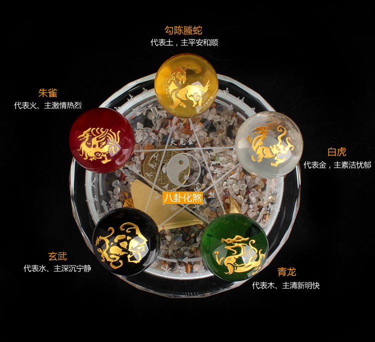 五行是中国古代的一种现代观,多用于哲学、中医学和周易占卜方面,五行是指金(白色),木(绿色),水(黑色),火(红色),土(黄色)。在自然界中,万物都有相生、相克相互牵连的关系,五行即是自然界万物的代名词。包括人们吃、穿、住、行及身体内脏器官和人的出生年、月、日。故五行就是相生相克的关系,所以五行跟人的运程、事业、爱情、婚姻紧密相关,缺一不可的,如有欠缺会导致事业不成、财运不佳、夫妻不和、子女不孝、身体欠佳、厄运连连等。为了解决众生短缺五行元素带来的危害。我们选用代表五行元素的五色水晶及七宝石、金银八卦、五帝钱、金元宝、朱砂转运符等传统风水吉祥物,组成一种五行和谐的催运法宝。